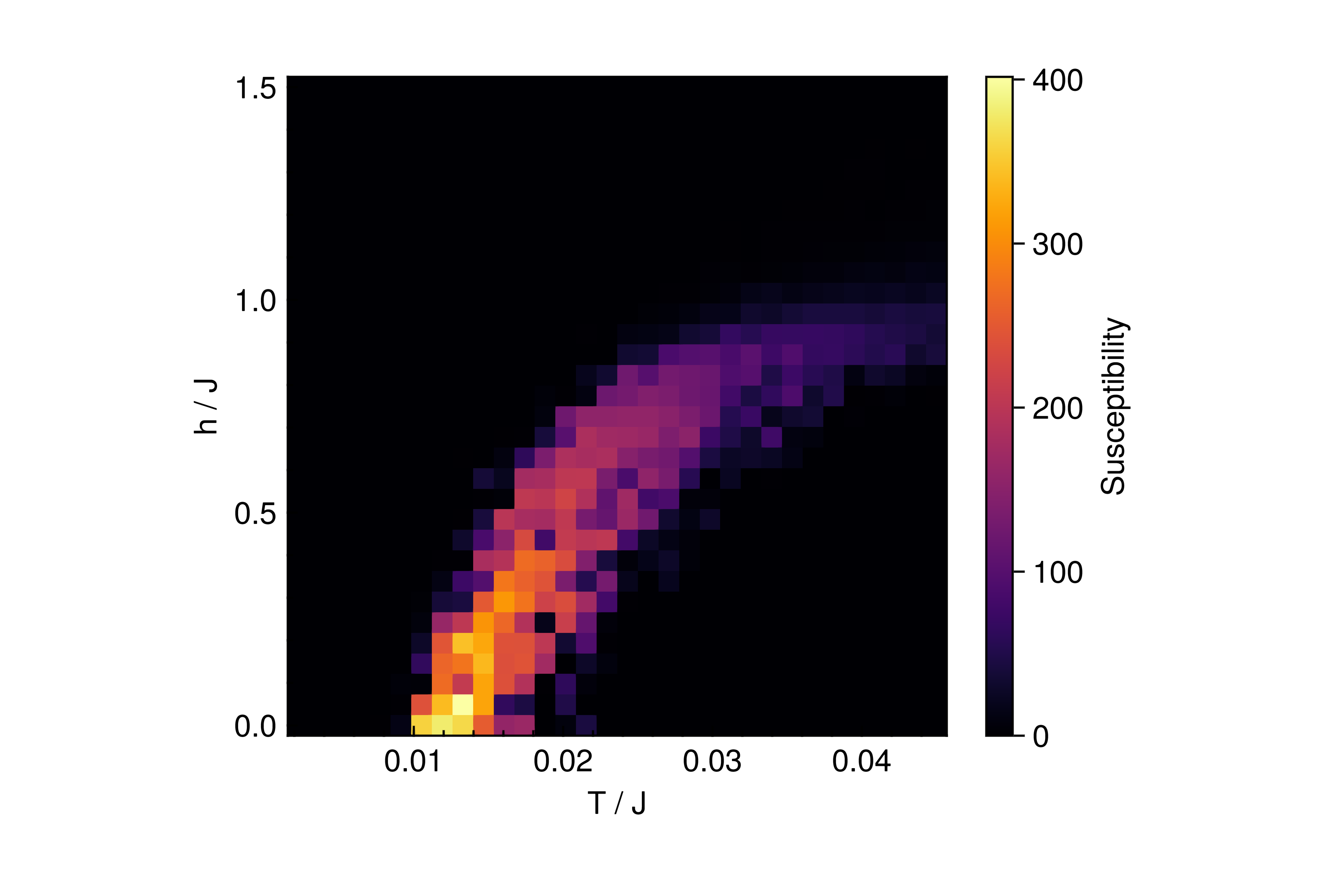 We can emply the Wolff algorithm to accelerate the flipping of spins by instead flipping a cluster of spins. In this algorithm (there are other cluster algorithms), a randomly selected spin (uniform sampling) is connected to its neighbours iff they share the same sign. The probability that both neighbors have the same sign is \(1-e^{-2\beta J}\), and is used for calculating adding links to the cluster (since they are assumed frozen). E.g. if \(s_{j_0}=s_{j_0+1}\), then \(s_{j_0+1}\) is added to the cluster if rand() < 1-exp(-2*β*J)